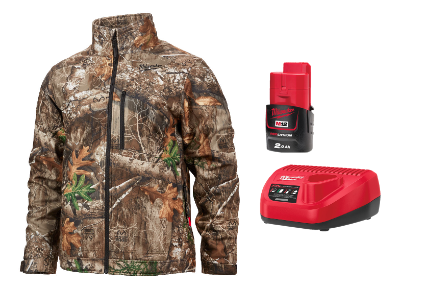 Kurtka podgrzewana z idealnie wtapiającym się wzorem kamuflażu, wykonana z nieszeleszczącego materiału aby zmniejszyć hałas podczas ruchu. Rozmiar XXXL. Dostarczana z akumulatorem M12 2,0 Ah oraz ładowarką M12 C12C.