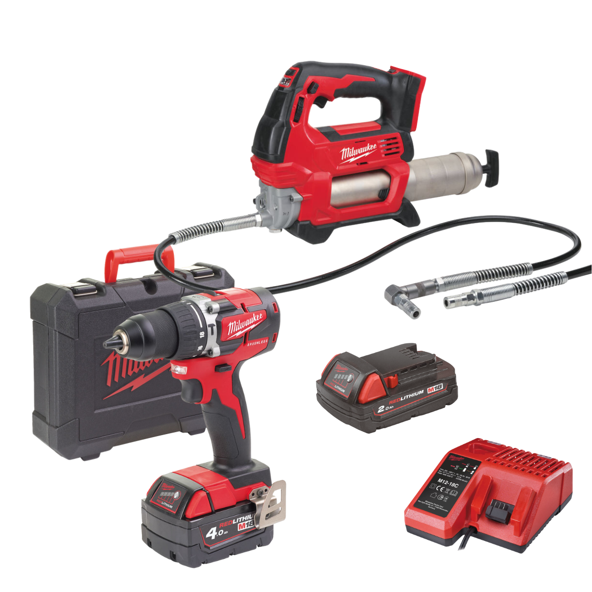 Zestaw elektronarzędzi Milwaukee idealny dla gospodarstwa rolnego wyposażony w smarownicę M18 GG, wkrętarkę udarową M18 CBLPD, dwa akumulatory oraz ładowarkę.
