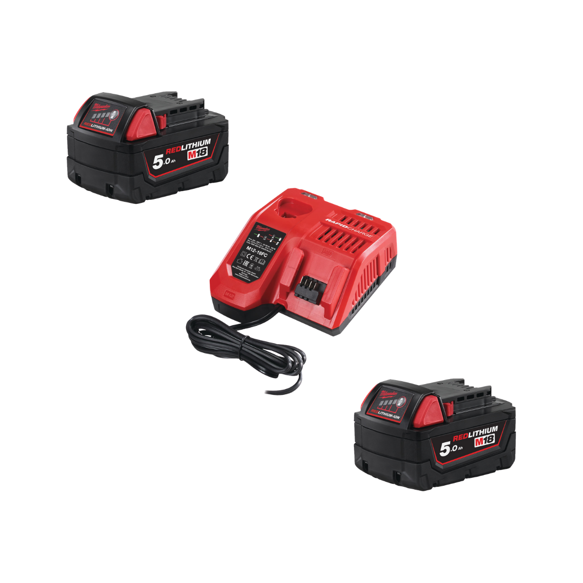 Zestaw startowy składający się z dwóch akumulatorów M18 5.0 Ah oraz szybkiej ładowarki M12-18FC