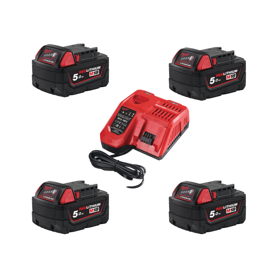 Zestaw startowy składający się z czterech akumulatorów M18 5.0 Ah oraz szybkiej ładowarki M12-18FC.