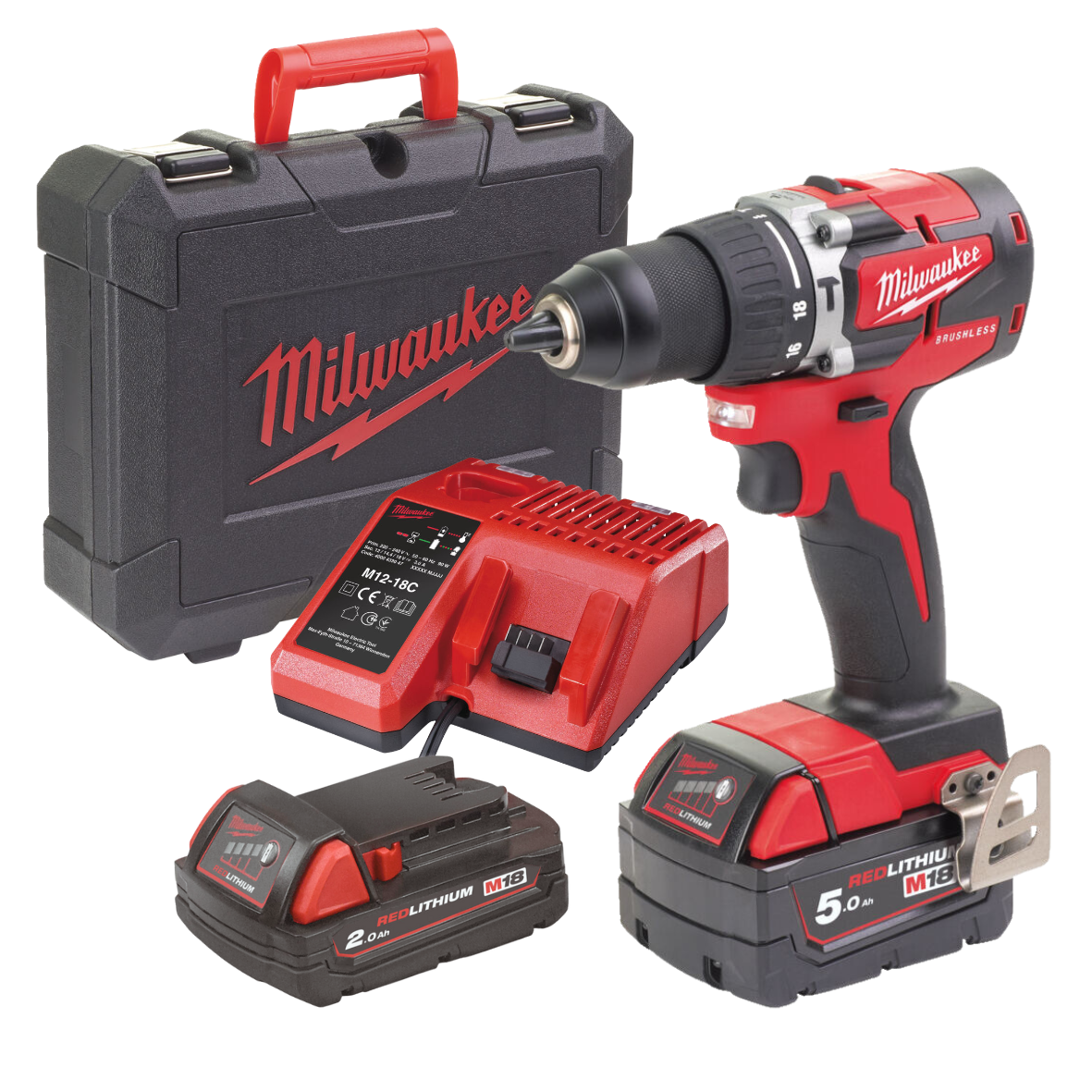 Zestaw z bezszczotkową wiertarko-wkrętarką z udarem mechanicznym o momencie obrotowym 60Nm w zestawie z dwoma akumulatorami: 1 x 5.0Ah oraz 1 x 2.0Ah, ładowarką oraz walizką - M18 CBLPD-522C Milwaukee.