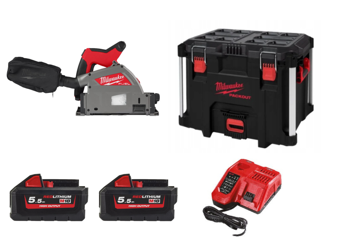 Zestaw akumulatorowa zagłębiarka z głębokością cięcia z użyciem listwy prowadzącej 55mm M18 FPS55-552P Milwaukee. Komplet składa się z zagłębiarki akumulatorowej, dwóch akumulatorów 18V o pojemności 5,5Ah każdy, szybkiej ładowarki dwusystemowej M1218FC. Całość została umieszczona w wyprofilowanej skrzyni transportowej Packout XL.