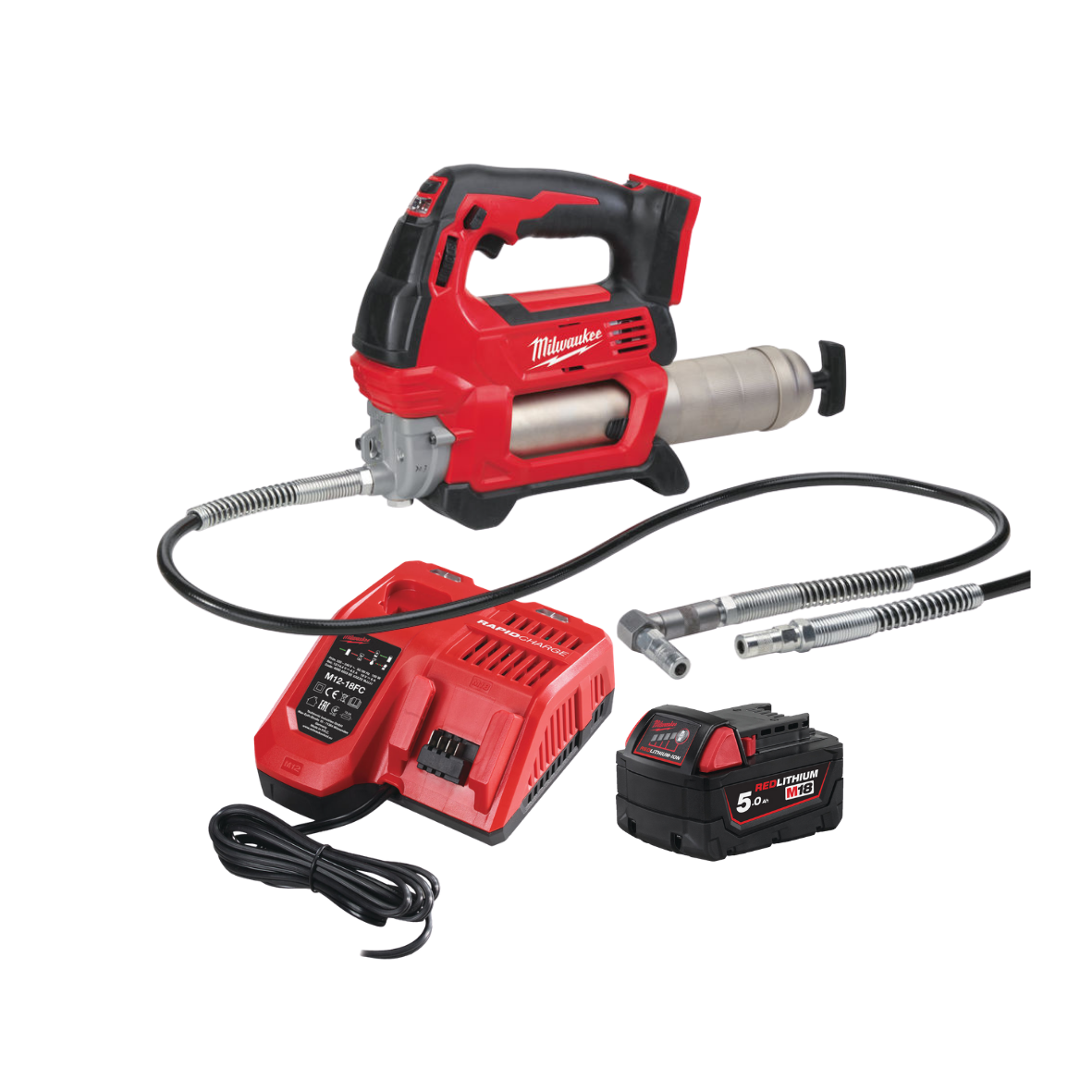 Smarownica (tawotnica) Milwaukee M18 GG w zestawie z jednym akumulatorem 5.0Ah oraz szybką dwusystemową ładowarką.